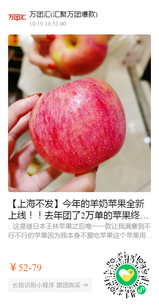 【上海不发】今年的羊奶苹果全新上线!!去年团了2万单的苹果终于等来!全好评! 【这是一个神奇的苹果 】用羊奶浇灌的万荣苹果·第一个代表中国出口美国的苹果·让不爱吃苹果的人都会爱上的苹果·一口就喜欢·吃过就难忘。 提醒:冰糖心会因为温度会有变化,不是每个都有冰糖心,但是甜度不变,