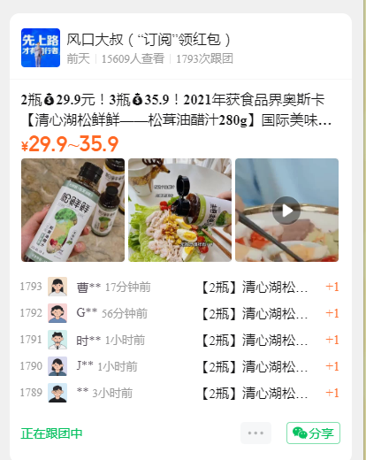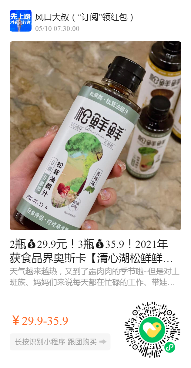 2瓶29.9元!3瓶35.9!2021年获食品界奥斯卡【清心湖松鲜鲜——松茸油醋汁280g】国际美味奖章 刘畊宏家同品牌~~