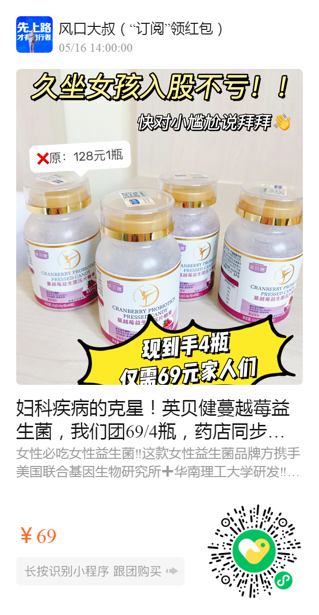 妇科疾病的克星!英贝健蔓越莓益生菌,我们团69/4瓶,药店同步在售128/瓶