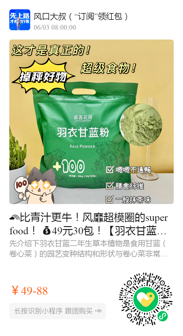 比青汁更牛!风靡超模圈的superfood! 49元30包!【羽衣甘蓝粉】蔬菜之王💥掉秤神器解决便秘! 刘畊宏女孩必备!巨清肠,含有丰富的膳食纤维,还有维生素C,K1,钾,铁等营养成分,每天喝一杯,肠胃特别舒服,可作为日常的部分代餐! 旗舰店1袋69,我们1袋49,2袋89!