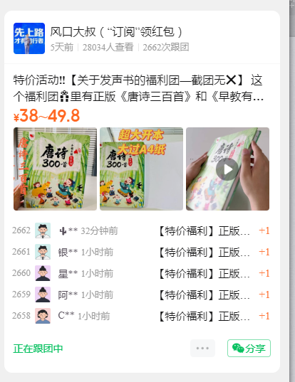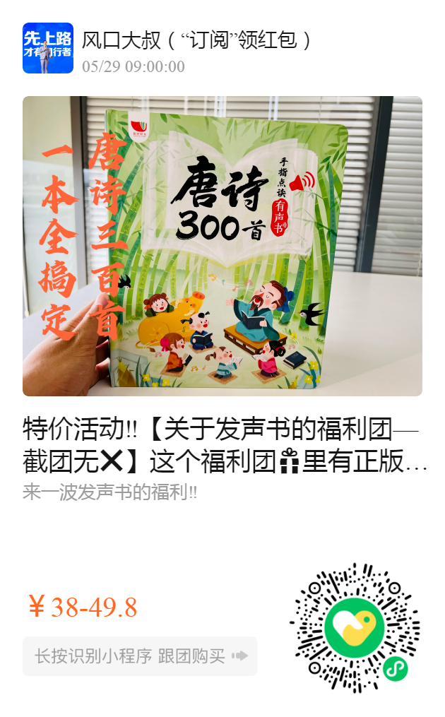 特价活动‼️【关于发声书的福利团—截团无】 这个福利团里有正版《唐诗三百首》和《早教有声书》学习本书的过程,就是一个不断探索的过程,孩子们通过触摸按键,接受学习内容,会更加专注,也让父母得以解放了。