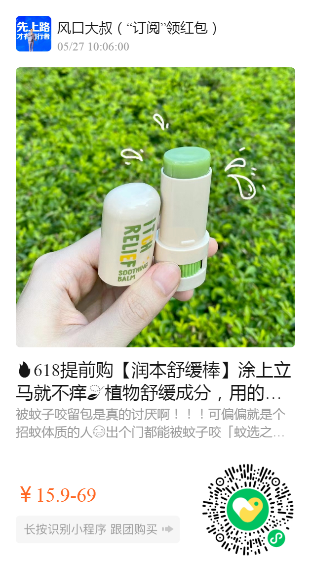 618提前购【润本舒缓棒】涂上立马就不痒植物舒缓成分,用的都是进口原料,涂抹超方便,成人款、儿童款🉑️选,组合直降10元这个价格买到就是赚到‼️