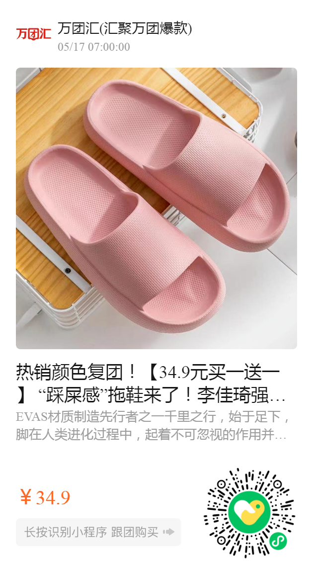 热销颜色复团!【34.9元买一送一 】 “踩屎感”拖鞋来了!李佳琦强力推荐同款“踩屎感拖鞋~今年超火!EVA材质,柔软回弹,脚感轻盈舒适!高颜值的外观,EVA超厚增高家用凉拖,千里之行,始于足下,脚在人类进化过程中,起着不可忽视的作用,并与大脑紧密相连,被称为“人的第二心脏”善待双脚,就要为它精挑细选一双拖鞋