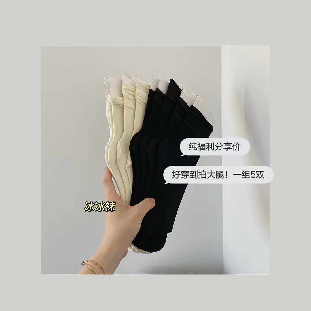 9.9到手5双!单双不到2块钱! 韩系冰冰袜真的YYDS!夏季穿搭的宝藏单品!喜欢穿长袜子又怕闷的一定要买!超显腿细!! 奶白色/黑色 永远不会错的颜色!配什么鞋子都好看~好穿到拍大腿系列