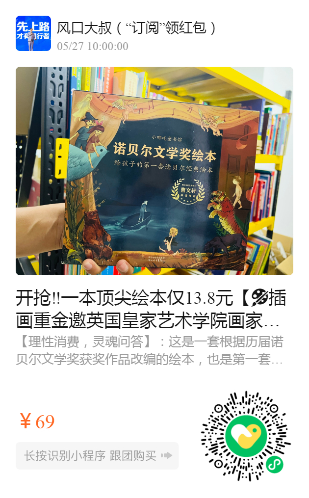开抢‼️一本顶尖绘本仅13.8元【插画重金邀英国皇家艺术学院画家】 每一套都是从116位诺贝尔文学奖得主的1000多部作品中,精选5本大师讲给孩子的陪伴故事 这是妈妈们选择信赖的绘本——正版礼盒装《诺贝尔文学奖绘本》