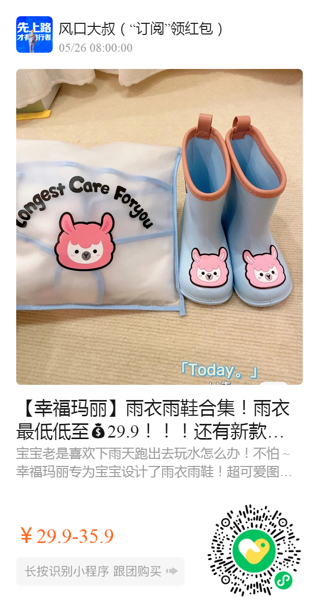 【幸福玛丽】雨衣雨鞋合集!雨衣最低低至29.9!!!还有新款上新! 夏天时不时就要下雨,给宝宝备上雨衣雨鞋很有重要性!带上宝宝一起去踩水~质量很好,不易坏!都是环保材料制作!健康安全!呵护宝宝的成长!冲丫!!