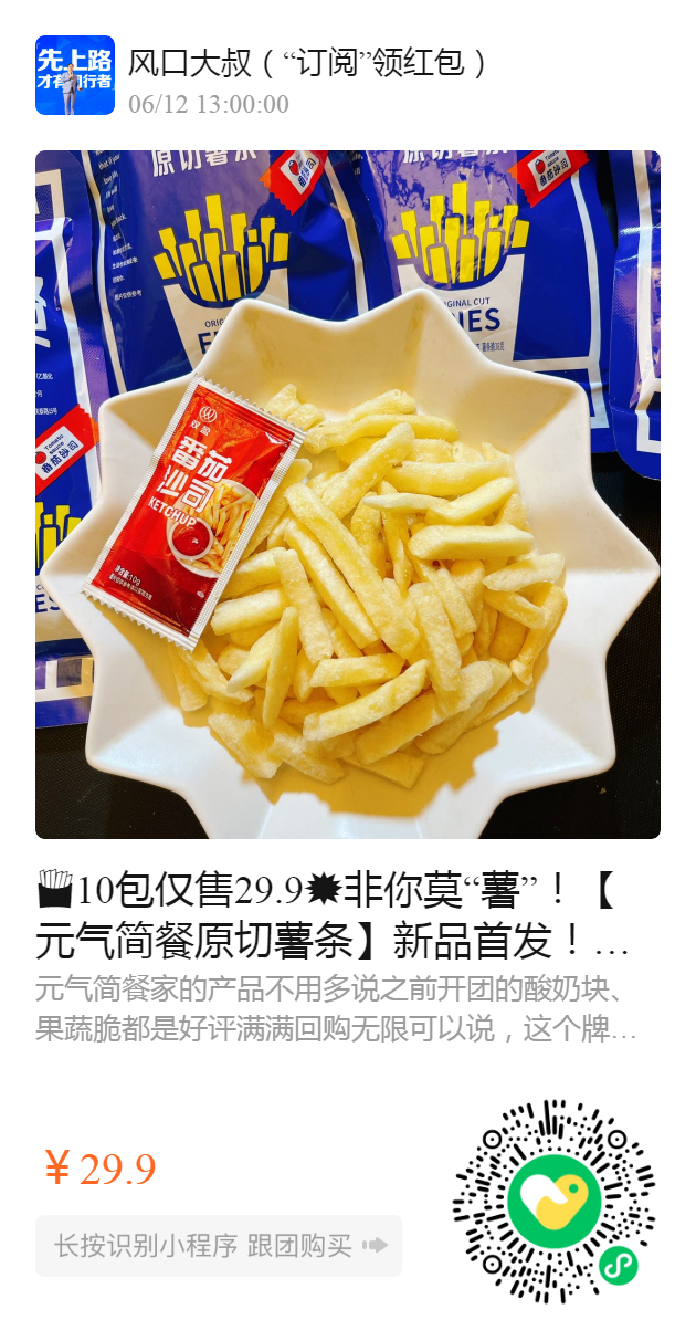 10包仅售29.9💥非你莫“薯”!【元气简餐原切薯条】新品首发!原薯鲜切,咸香酥脆,非油炸,真空低温脱水新技术,不油腻不上火,好吃不发胖~ 无防腐剂,无添加剂 无香精,天然原味,美滋美味 每袋薯条均配有专属CP--番茄沙司 黄金搭档 美味升级