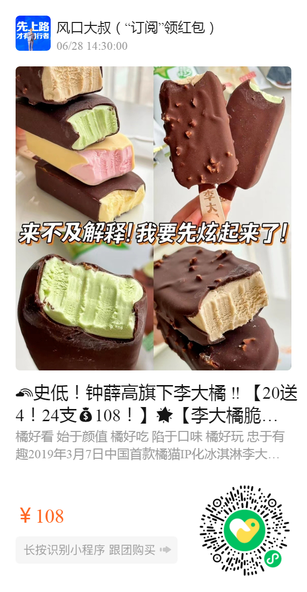 史低!钟薛高旗下李大橘 ‼️ 【20送4!24支108!】【李大橘脆皮系列】一根只需4.5r的钟薛高还不屯吗! 火爆全网和线下,荣获“罗森点点五周年最受欢迎产品”!真正全乳脂冰淇淋甜蜜与清凉在口腔碰撞,承包你今夏的冰柜