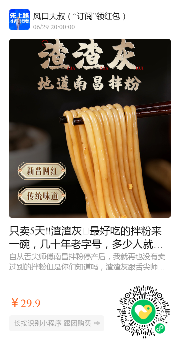 29.96盒,品牌方亏本推广,一包泡面都不止这个价,别说味道巨赞,不用出远门也能吃到的南昌拌粉,碗底都想舔干净不好吃找我