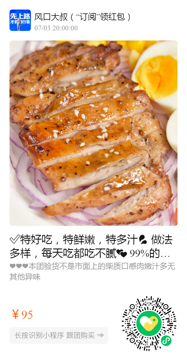 ✅特好吃,特鲜嫩,特多汁 做法多样,每天吃都吃不腻💕 99%的人都没吃过的鸡腿扒~~ 散养土鸡 ,鸡上腿肉制作 不是鸡胸肉❗ 不是拼接肉❗ 个子更大,肉更厚,更新鲜多汁 两种口味——黑胡椒、原味 无防腐剂,无香精,无化学添加剂 理想中鸡腿扒该有的样子! 上海,北京可发