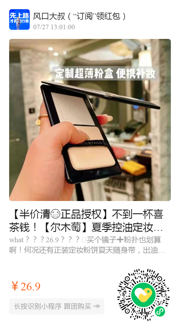 【半价清正品授权】不到一杯喜茶钱!【尔木萄】夏季控油定妆粉饼,一键磨皮!无油!无防腐剂!无滑石粉!无致痘成分!粉饼配备超大面化妆镜🪞!外出补妆超方便!让大油田在这个夏天不再焦虑! 旗舰店售价55元!团购价仅需26.9,2024.10