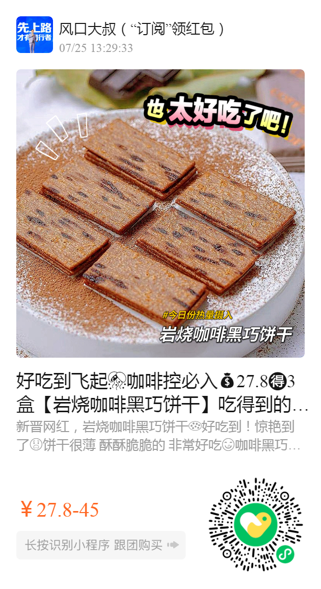 好吃到飞起🎊咖啡控必入27.83盒【岩烧咖啡黑巧饼干】吃得到的coffee,看得见的黑巧,0反式脂肪酸❗️ ✅纯可可脂、可可粉~饼干还看得到🍫巧克力碎,全脂乳粉!牛乳分离的进口奶油❗️ 一块饼干,吃出摩卡咖啡风味😋海盐岩烧风味太上瘾了!姐妹👭们煲剧请囤多几盒哇❗️