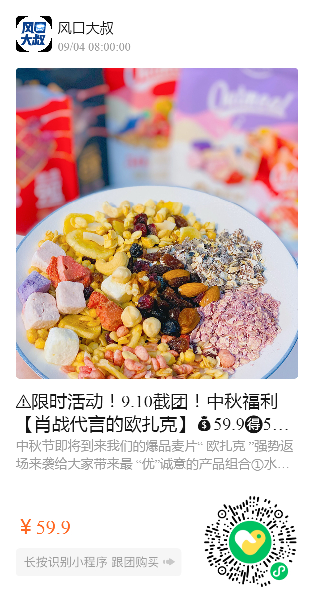 ️限时活动!9.10截团!中秋福利【肖战代言的欧扎克】59.9️5袋麦片+送两袋坚果,共7包!麦片天花板‼