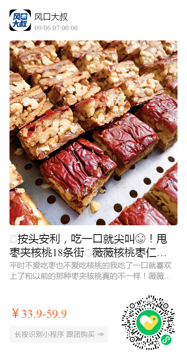 🐿按头安利,吃一口就尖叫😋!甩枣夹核桃18条街🌝薇薇核桃枣仁派,全程纯手工、零添加,现做现发,开袋即食,狗头枣枣味甜而不腻,核桃香味浓郁,料超足,每一口,都有紧实可口的坚果和大枣!熟枣加工更好吸收,另有添加山楂,太好吃!最新日期现做现发!httd