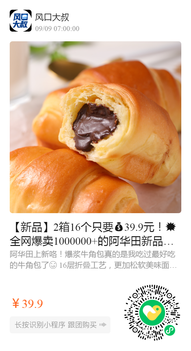 【新品】2箱16个只要39.9元!💥全网爆卖1000000+的阿华田新品来袭——爆浆牛角包! ✅ 日本北海道进口黄油 ✅ 注入阿华田专用麦芽可可巧克力酱 👅浓浓的阿华田风味,活力满满一整天~ 👅甜度刚刚好️,让人越吃越想吃! 最新日期,保质期3个月!