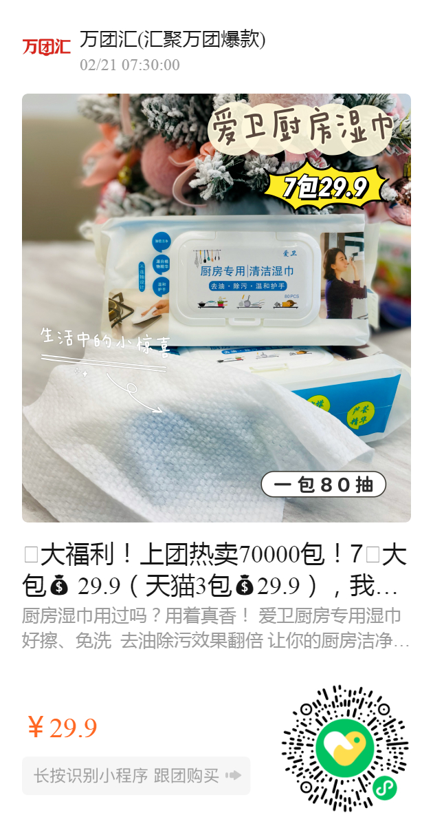 🥬大福利!上团热卖70000包!️大包 29.9(天猫3包29.9),我们到手 4.3一包【爱卫厨房80抽湿巾】来咯!天猫月销3000+,告别传统,一片轻松去油污!