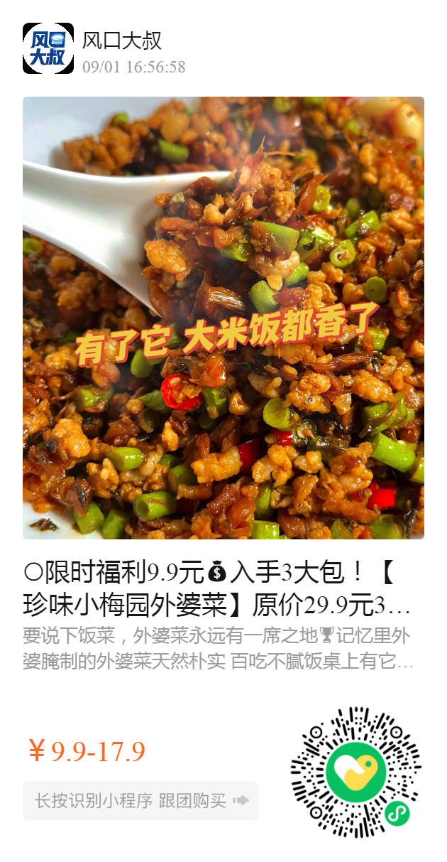 ️限时福利9.9元入手3大包!【珍味小梅园外婆菜】 原价29.9元3包的,分量足一口气能干三碗饭的下饭神菜!! 地道湘西味,鲜辣香脆巨下饭🥣 拿肉都不换的下饭王外婆菜🌝吃了不会忘的美味!!
