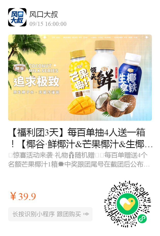 【福利团3天】每百单抽4人送一箱!【椰谷·鲜椰汁&芒果椰汁&生椰拿铁】