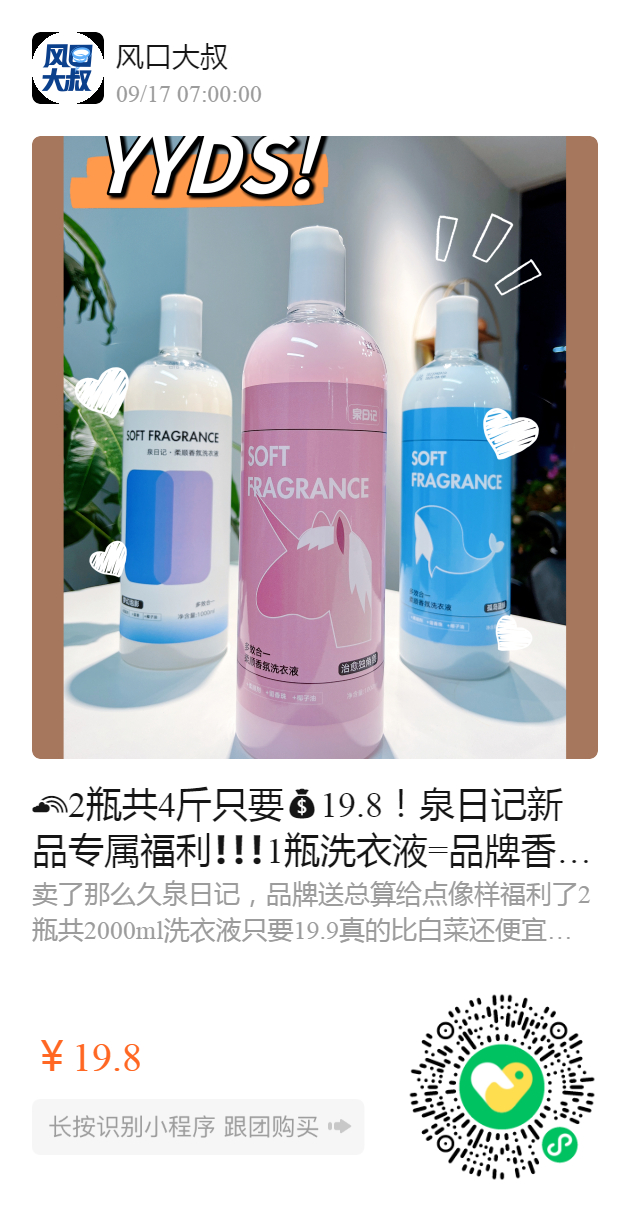2瓶共4斤只要19.8!泉日记新品专属福利❗️❗️❗️1瓶洗衣液=品牌香水+洗衣液+柔顺剂,洗完的衣服有种自带体香的感觉,闻着就比别人贵! 梦幻的颜色、沁人心脾的香氛,真的是长在我的审美上,简直就是为衣物留香而生,为衣物柔顺而作🫶🏻