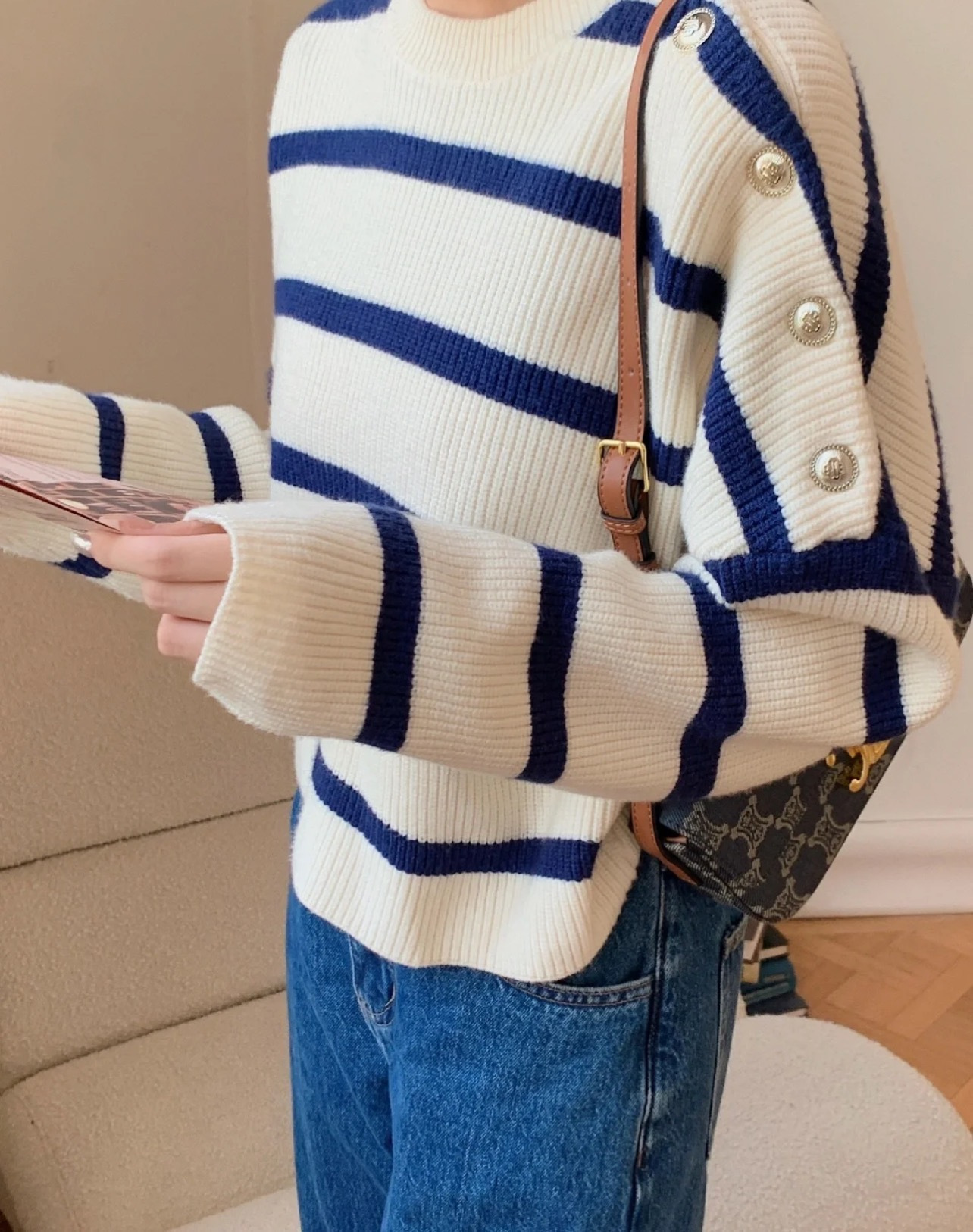 产品名称:M家法式海军蓝条纹纽扣点缀针织上衣