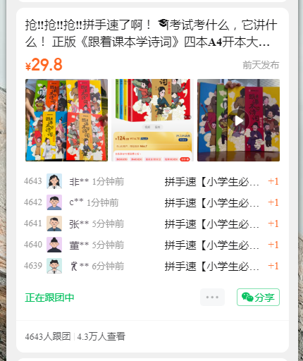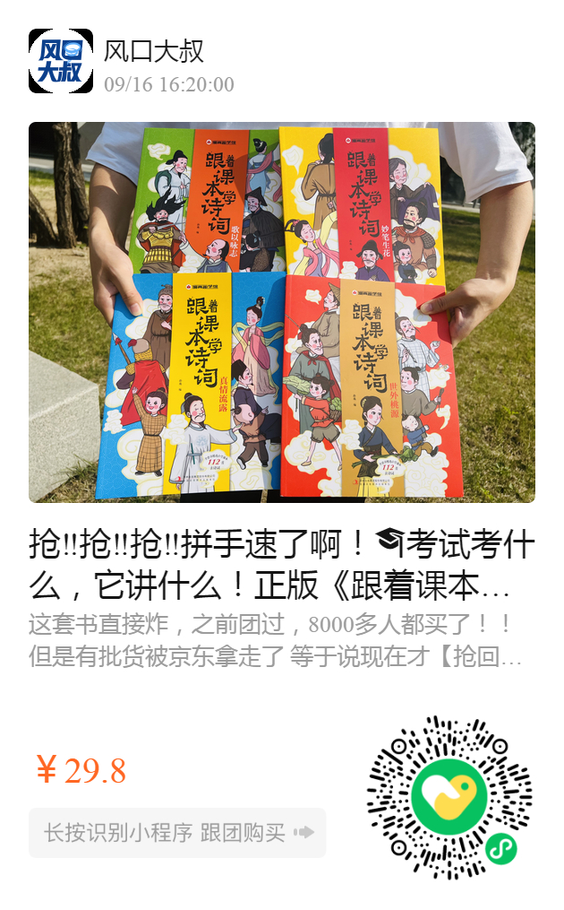 抢‼️抢‼️抢‼️拼手速了啊! 考试考什么,它讲什么! 正版《跟着课本学诗词》四本A4开本大小,每本厚度将近60页的一套诗词书! 目前京东抢过来的货,来之不易,京东还在66卖!由北上广一线语文教师排版臻选112首经典诗词📚