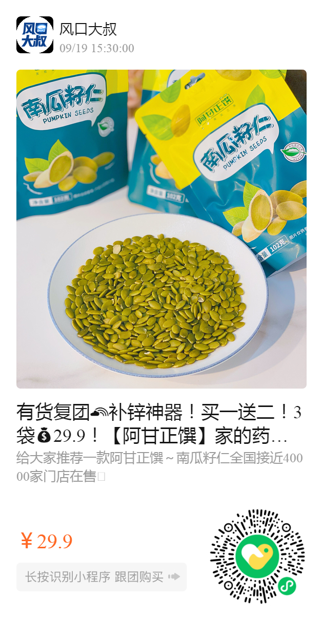 有货复团补锌神器!买一送二!3袋29.9!【阿甘正馔】家的药食同源小零食南瓜籽仁102g,成分只有南瓜籽!