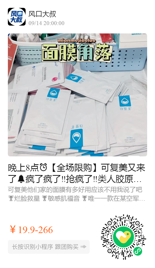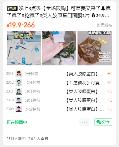 晚上8点⏰【全场限购】可复美又来了疯了疯了‼️抢疯了‼️类人胶原蛋白面膜2片 24.9「可复美」液体敷料面膜丨黄金面膜丨2张只要19.9元🤩修复敷料19.9元买一赠一🤩每个商品每位团员只能买一份‼️可复美有多好用不用我说了吧类人类胶原蛋白修护肌肤「筑屏障」「高保湿」「修复受损肌肤」
