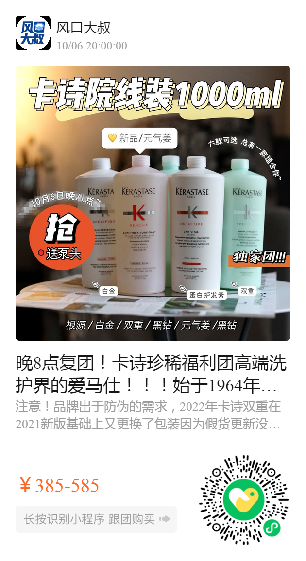 晚8点复团!稀福利团 高端洗护界的爱马仕!!! 始于1964年的头皮头发奢护专家 —卡诗(Kérastase)超值1000ml院线装 约等于院线装5折,一瓶即省好几百, 在家享受高端沙龙级护理,精致到头发丝儿! 正规报关进口。 注意:双重已是最新包装