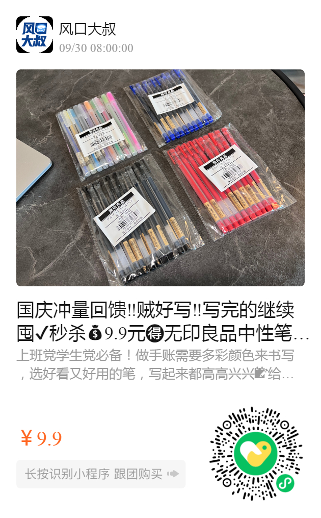 国庆冲量回馈‼️贼好写‼️写完的继续囤✔️秒杀9.9元️无印良品中性笔 真的巨值 巨值 必囤榜no.1 书写流利不断水,黑蓝红三种颜色➕彩色可选,满足你的各种书写需求✍️随手撸!总是找不到笔去了哪里!备用起来!