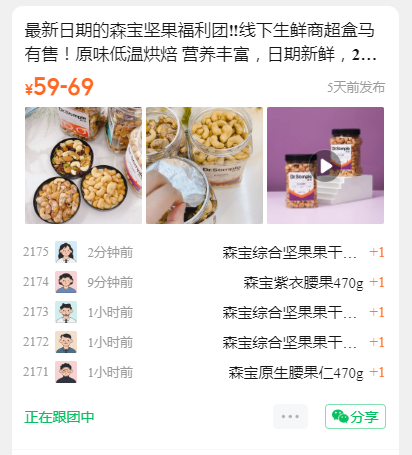 最新日期的森宝坚果福利团‼️线下生鲜商超盒马有售!原味低温烘焙 营养丰富,日期新鲜,2022.9产! 炭烧腰果旗舰店69,团购39.9! 紫衣腰果旗舰店79,团购59! 综合坚果旗舰店79.9,团购59! 原生腰果旗舰店89.9,团购69!