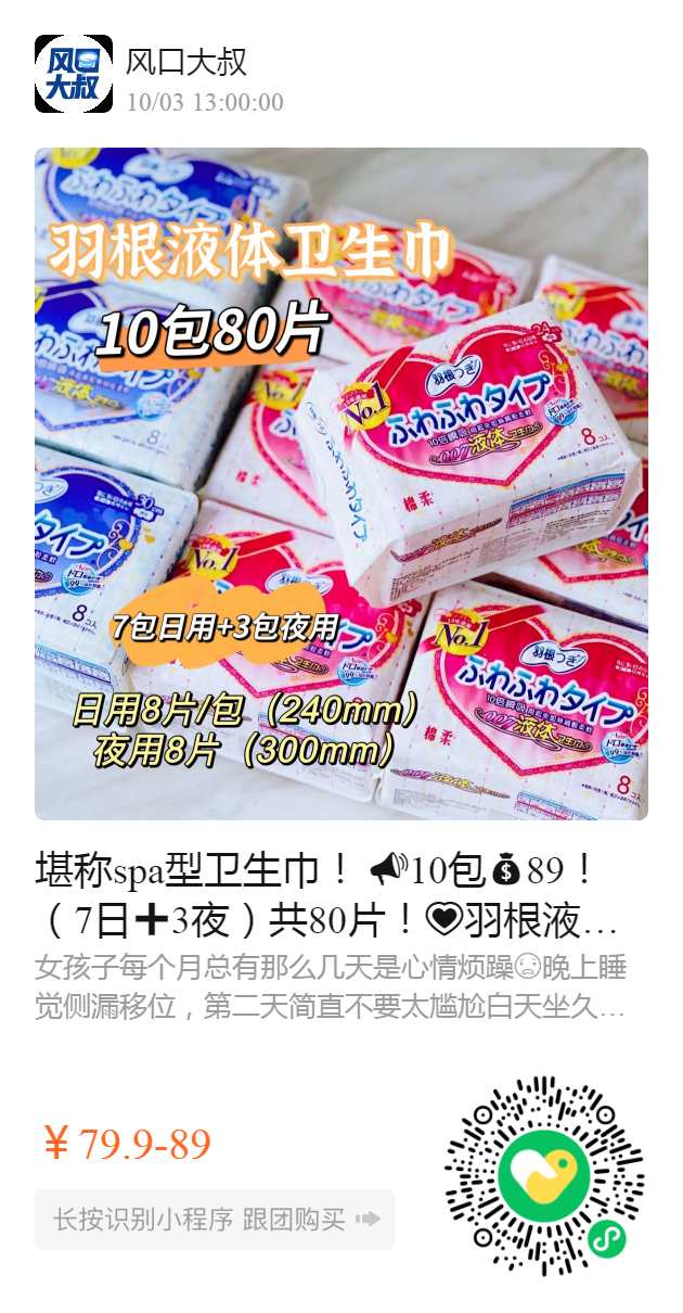堪称spa型卫生巾! 10包89!(7日➕3夜)共80片!羽根液体卫生巾,首创7条液体导流技术,3.5秒分流瞬吸,无惧任何潮涌!穿戴0触感,守护敏感肌!