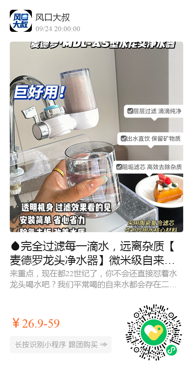 💧完全过滤每一滴水,远离杂质【麦德罗龙头净水器】微米级自来水龙头净水器,让生活用水更健康‼️ 淘宝售价198元 我们团购59元 ✅透明视窗设计,不用电无废水 ✅微米级滤芯净化水质 ✅分体式设计拆装简易,安装便捷 ✅一机两用,原水解决洗漱,净水用于生活