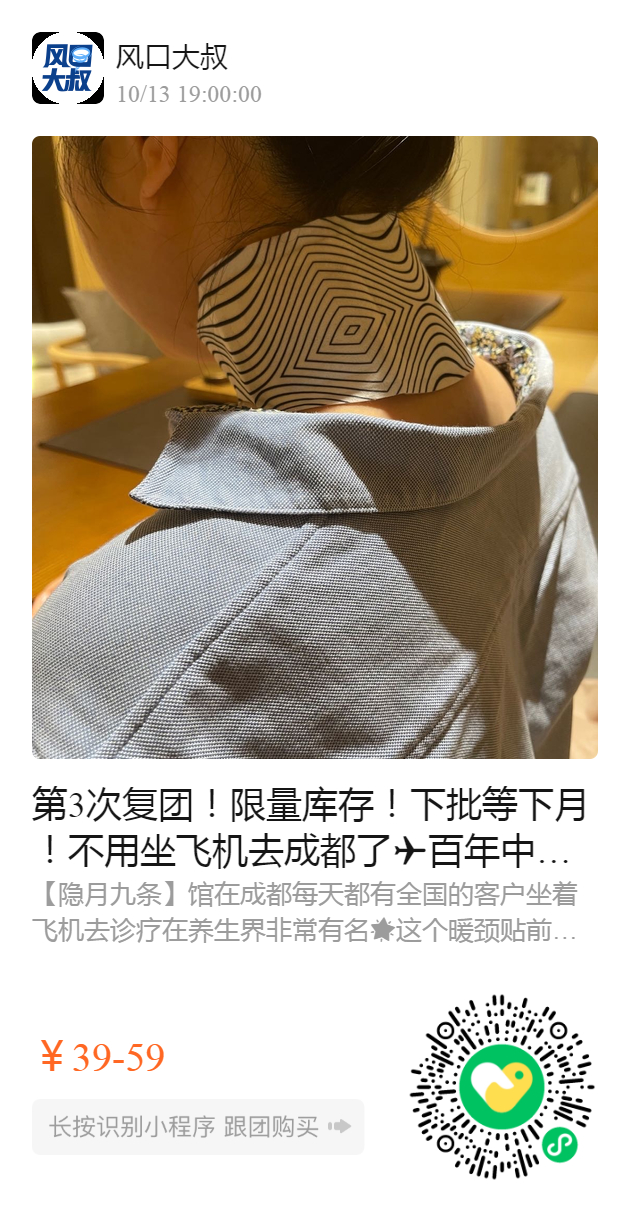 第3次复团!限量库存!下批等下月!不用坐飞机去成都了️百年中医世家惠比寿老中医精心研制而出☑️试过无数款暖颈贴💥【隐月九条】这款药味最浓郁🌿 对我每天低头工作14小时的脖子是真正有效的良心产品业界知名无数好评复购! ️实体店1盒99.9,我们团购39,一盒4片!