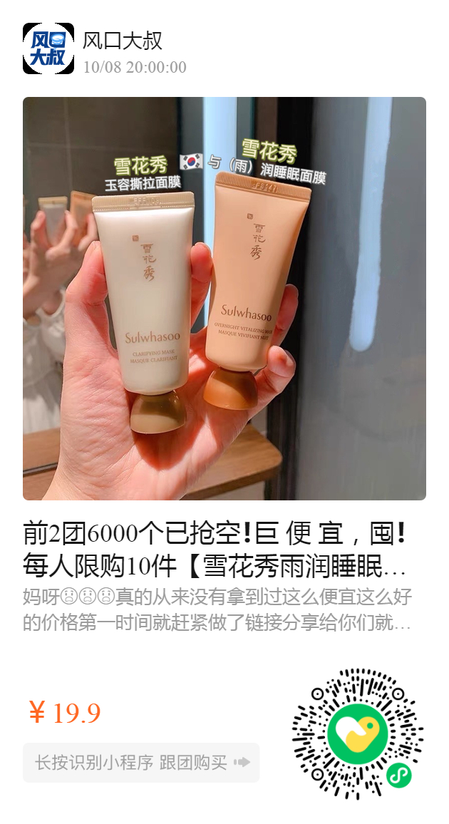 前2团6000个已抢空❗️巨 便 宜,囤❗️每人限购10件【雪花秀雨润睡眠面膜/玉容撕拉面膜35ml】 夜间修护&祛黄提亮