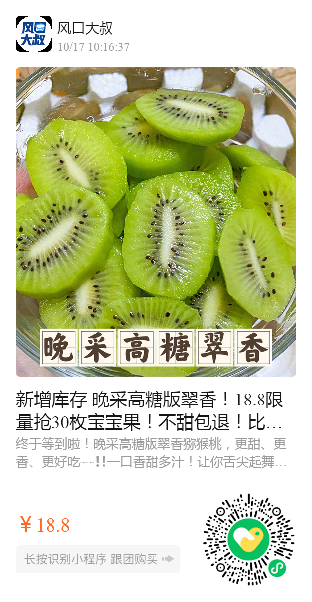 新增库存 晚采高糖版翠香!18.8限量抢30枚宝宝果!不甜包退!比之前更甜~口感更好~ 传闻中的王炸猕猴桃💥陕西周至【翠香猕猴桃🥝】最好吃的猕猴桃,一款原生态 纯天然有机种植的猕猴桃🌲 ❗️找遍水果店都看不到翠香~💥果然名不虚传~赶紧来试试!