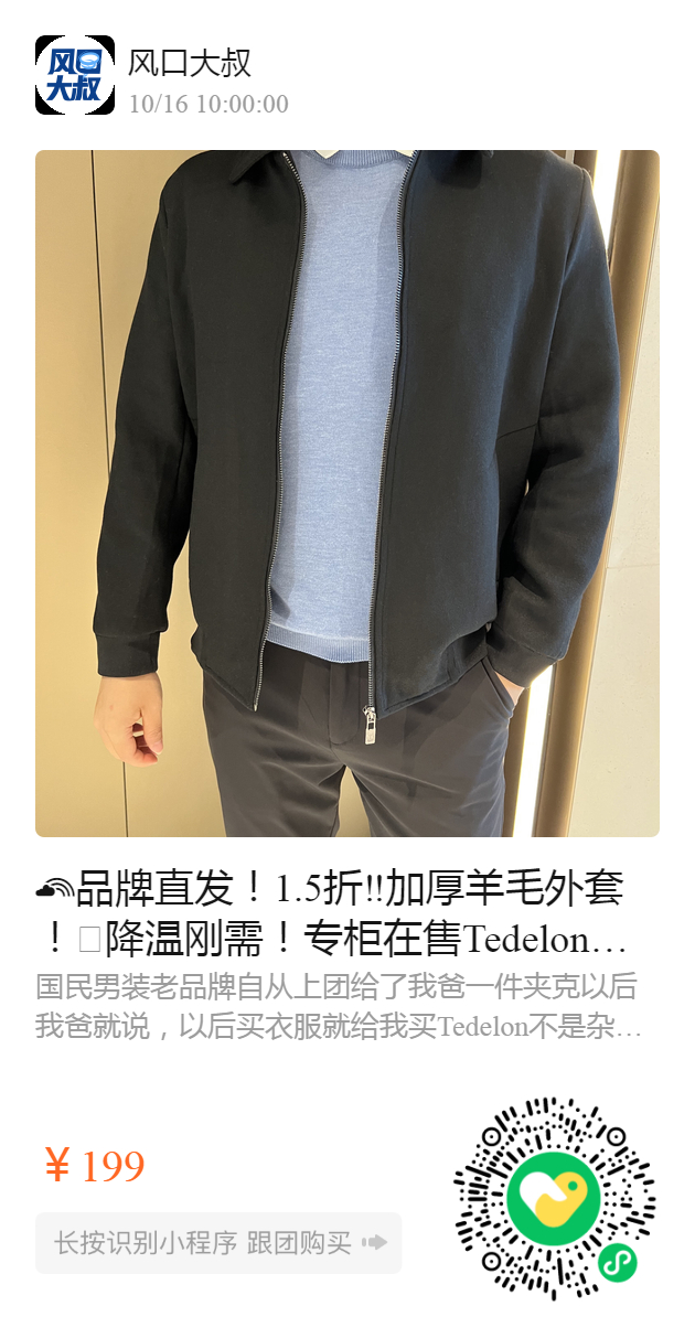 品牌直发!1.5折‼加厚羊毛外套!️🥶降温刚需!专柜在售Tedelon秋冬新款高端系列加厚翻领美丽诺羊毛混纺夹克!全国前10强男装品牌!千元级品质高级货!
