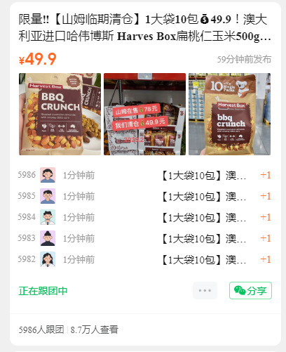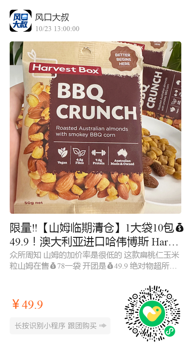 限量‼️【山姆临期清仓】1大袋10包49.9!澳大利亚进口哈伟博斯 Harves Box扁桃仁玉米500g!足足一斤!