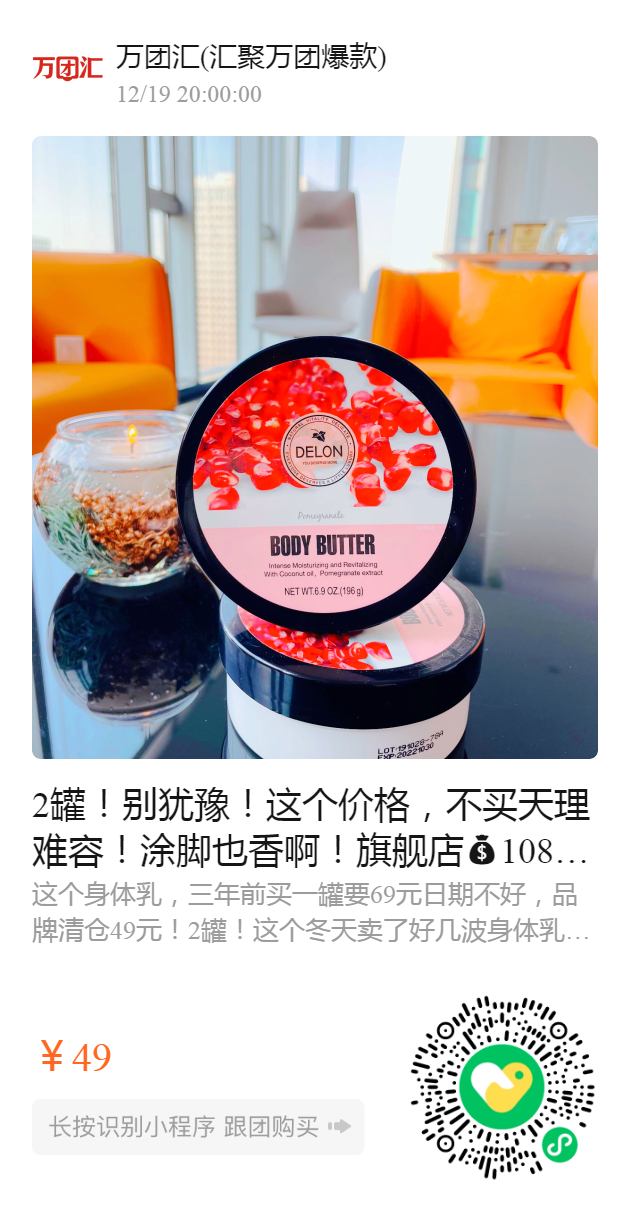 2罐!别犹豫!这个价格,不买天理难容!涂脚也香啊!旗舰店108元/2罐,我们49元/2罐!加拿大国宝Delon身体乳196g!红石榴味味!好闻好用!进博会参展产品,加拿大总理亲自推荐!