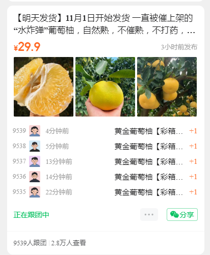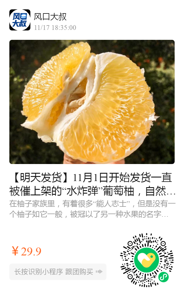 【明天发货】11月1日开始发货 一直被催上架的“水炸弹”葡萄柚,自然熟,不催熟,不打药,吃得更健康 终于上架咯~ 它能像爱媛果冻橙那样,多汁到可以“喝着吃”,且兼具柚的清甜和橘的细嫩,润鲜润鲜的。 被称为“柚中爱媛”。果肉嫩得像豆腐,果粒饱满,爆汁,真正的“水”果,名副其实!
