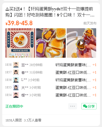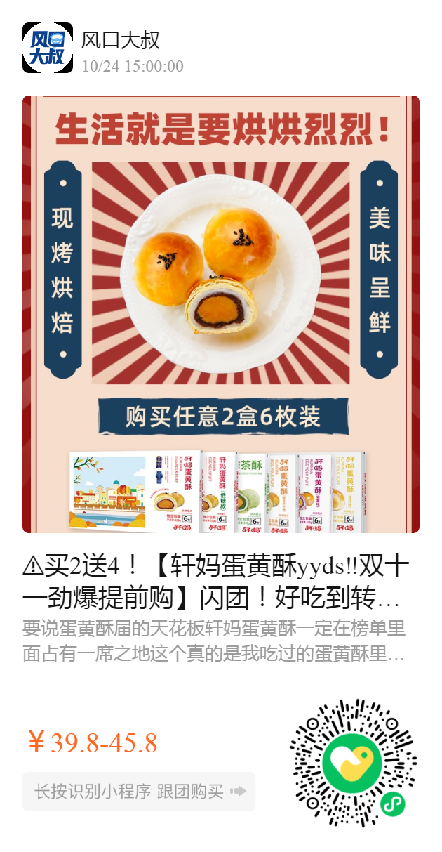 ️买2送4!【轩妈蛋黄酥yyds‼️双十一劲爆提前购】闪团!好吃到转圈圈️!8个口味! 双十一劲爆活动💥购买任意口味产品2盒送4枚mini,买4盒送8枚! 皮薄馅多,不用加热就能拉丝~ 全部新鲜生产到家,老少皆宜的健康小零食!