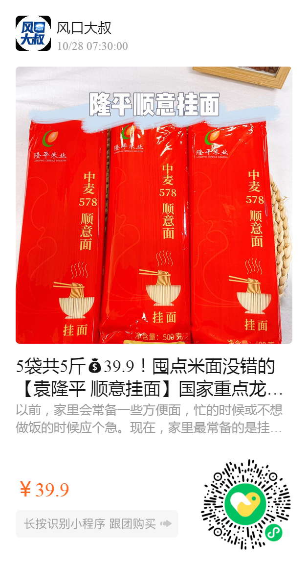5袋共5斤39.9!囤点米面没错的【袁隆平 顺意挂面】国家重点龙头企业出-隆平米业挂面 挂面光滑有韧性不粘锅、不浑汤细腻可口,纯正的面味,健康的首选! ✅加点蔬菜、蘑菇什么的煮一碗,吃起来有滋有味,比方便面营养足,也更健康!2023.4