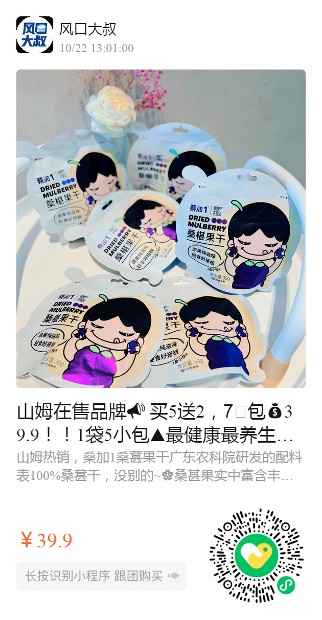山姆在售品牌 买5送2,️包39.9!!1袋5小包🔺最健康最养生的桑葚果干,【桑加1桑葚果干】随身携带吃,保护视力,补气血,生发乌发,美容养颜,好处特别多✔️