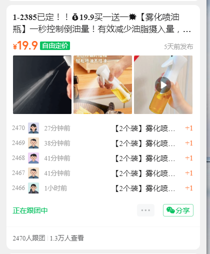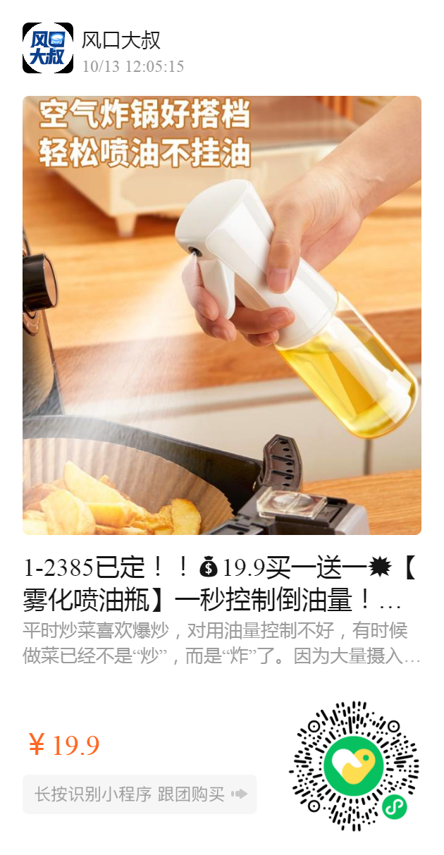 1-2385已定!!19.9买一送一💥【雾化喷油瓶】一秒控制倒油量!有效减少油脂摄入量,一键开启健康生活🏻 喷出状态是雾状,很细腻很均匀地就可以铺满整个锅底 减脂人真的爱了,也特别适合想要清淡饮食的姐妹们!!家里有娃和老人的更是必备的油壶!!