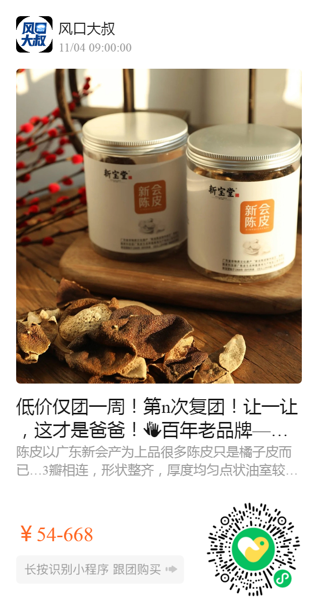 低价仅团一周!第n次复团!让一让,这才是爸爸!百年老品牌——新宝堂陈皮!特殊时期多喝陈皮!新增礼盒版!
