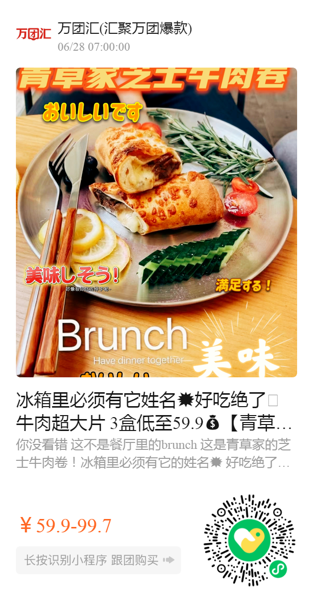 冰箱里必须有它姓名💥好吃绝了🥩牛肉超大片 3盒低至59.9【青草家 芝士牛肉卷】山姆会员店同款老罗直播间也在卖🉑 全新口味抢鲜上市😆精选小麦粉 造就金黄酥脆的秘密选用“奶酪之花”之称的马苏里拉奶酪 一口拉丝 馅料十足 大片牛肉看得见‼️好评超多 无限回购绝