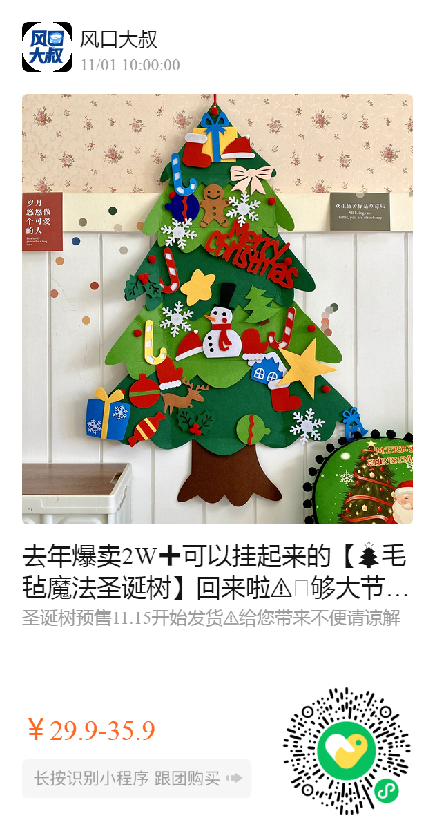 去年爆卖2W➕可以挂起来的【毛毡魔法圣诞树】回来啦️🌲够大节日氛围感拉满方便收纳 ✅小成本大收获的DIY魔法贴 孩子可自由发挥摆放设计 ✅跟团即赠灯饰 搭配灯串美翻啦~浓浓的圣诞气氛🏻️ 低至29.9get❗️这也太值啦🙀墙裂推荐