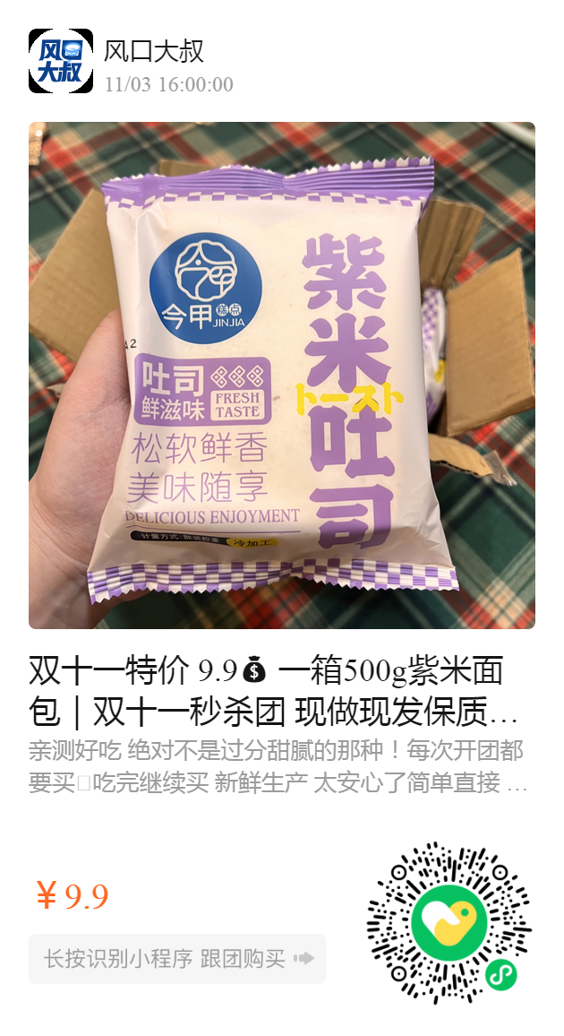 双十一特价 9.9 一箱500g紫米面包|双十一秒杀团 现做现发保质期12天【今甲紫米面包】 月销10w+的软糯紫米奶酪夹心早餐面包🤤 一箱5个扎扎实实独立包装足足有500g 🏻 超好吃😋奶香浓郁🥛片片松软 口口新鲜 早餐好伴侣【吐司➕奶酪➕紫米】香甜好滋味 (和小养紫米面包一个工厂生产)