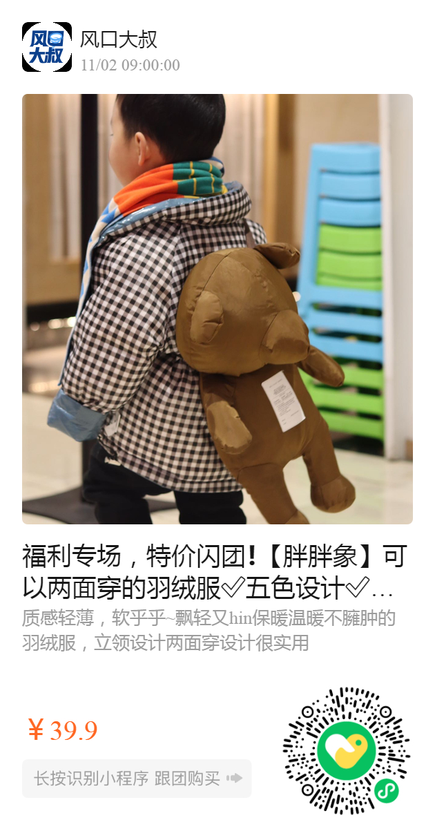 福利专场,特价闪团❗【胖胖象】可以两面穿的羽绒服 ✅五色设计✅正反皆可穿✅男女宝都可✅内里填充90%白鸭绒 日常开团59.9,现在特价仅39.9