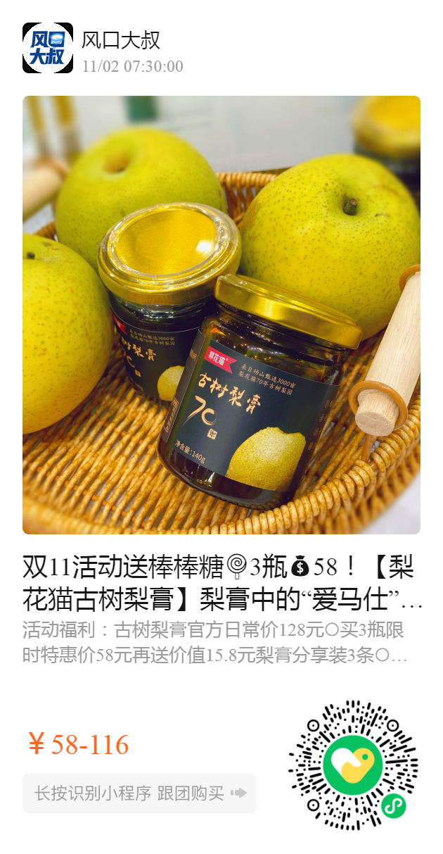 双11活动送棒棒糖🍭3瓶58!【梨花猫古树梨膏】梨膏中的“爱马仕”!最放心的纯鲜果梨膏!新日期!
