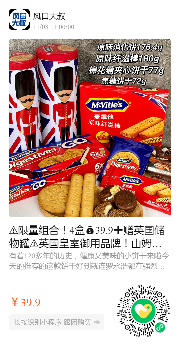 ️限量组合!4盒39.9➕赠英国储物罐️英国皇室御用品牌!山姆在售💥【英国麦维他经典饼干组合】优惠来袭❗❗ 巧克力涂层+全麦饼干+棉花糖+焦糖! 💯不含代可可脂,赠英国士兵储物罐,王炸组合。 ✔️消化饼的鼻祖,上班族必备的完美下午茶饱腹感强。2023.8